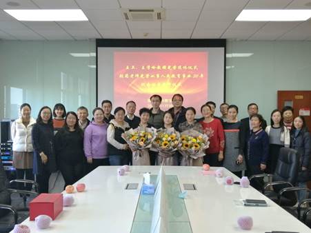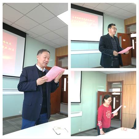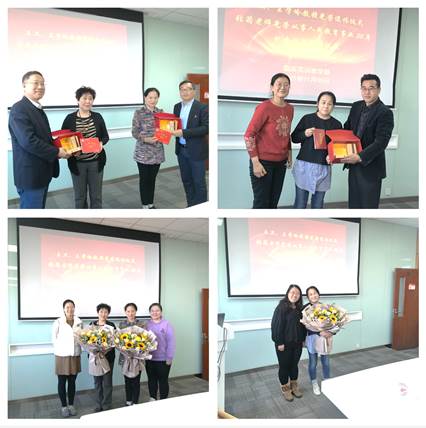 首先,全体教师共同奏唱《中华人民共和国国歌》。在观看教研室为三位老师精心制作的成就回顾和祝福视频后,青年教师代表献上鲜花,各位领导颁发了纪念品、证书和工会服务卡,并致上感谢信。王卫和王学岭两位老师准备了象征“平安”的苹果,也给大家送上一份健康平安的祝福。最后,党政领导班子以一首共同创作的小诗为三位老师送上祝福:三寸粉笔三尺台,三更伏案三刻白。三十精进三番建,三千桃李三秋怀。祝王卫老师、王学岭老师退休生活丰富多彩,身体健康!贺张筠老师三十年硕果累累,再续华章!