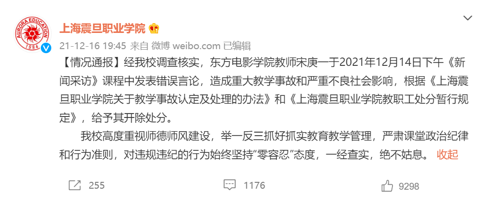 经我校调查核实,东方电影学院教师宋庚一于2021年12月14日下午《新闻采访》课程中发表错误言论,造成重大教学事故和严重不良社会影响,根据《上海震旦职业学院关于教学事故认定及处理的办法》和《上海震旦职业学院教职工处分暂行规定》,给予其开除处分。